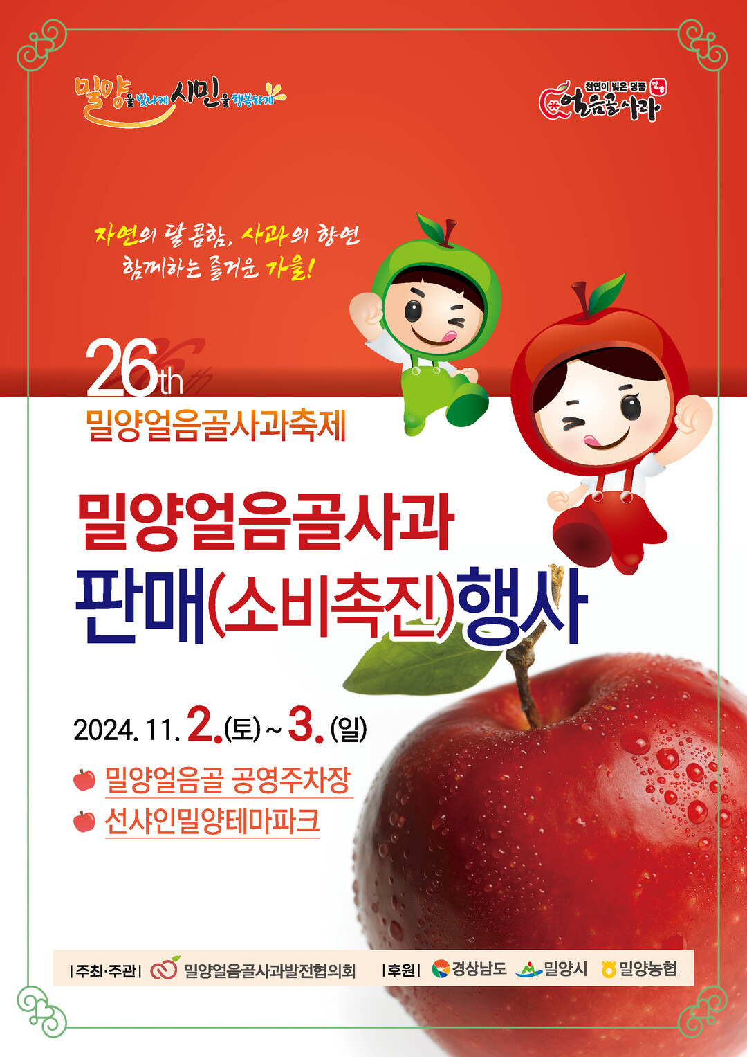 축제는 밀양 얼음골 공영주차장과 선샤인 밀양 테마파크에서 열립니다. 행사 시간은 매일 오전 11시부터 오후 5시까지로, 다양한 프로그램이 준비되어 있습니다. 특히, 사과를 주제로 한 다양한 공연과 체험 부스가 마련되어 있어 가족 단위 방문객들에게도 좋은 시간이 될 것입니다.