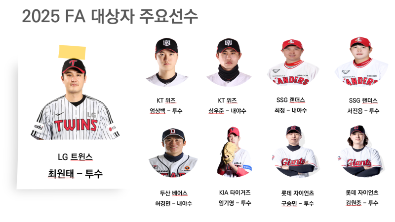 이번 FA 시장에서 주목할 만한 선수들은 다음과 같습니다. LG 트윈스의 최원태, KT 위즈의 엄상백, 두산 베어스의 허경민 등이 있습니다. 이들은 각 팀에서 핵심적인 역할을 해온 선수들로, 이적 시 팀에 큰 영향을 미칠 것으로 예상됩니다.